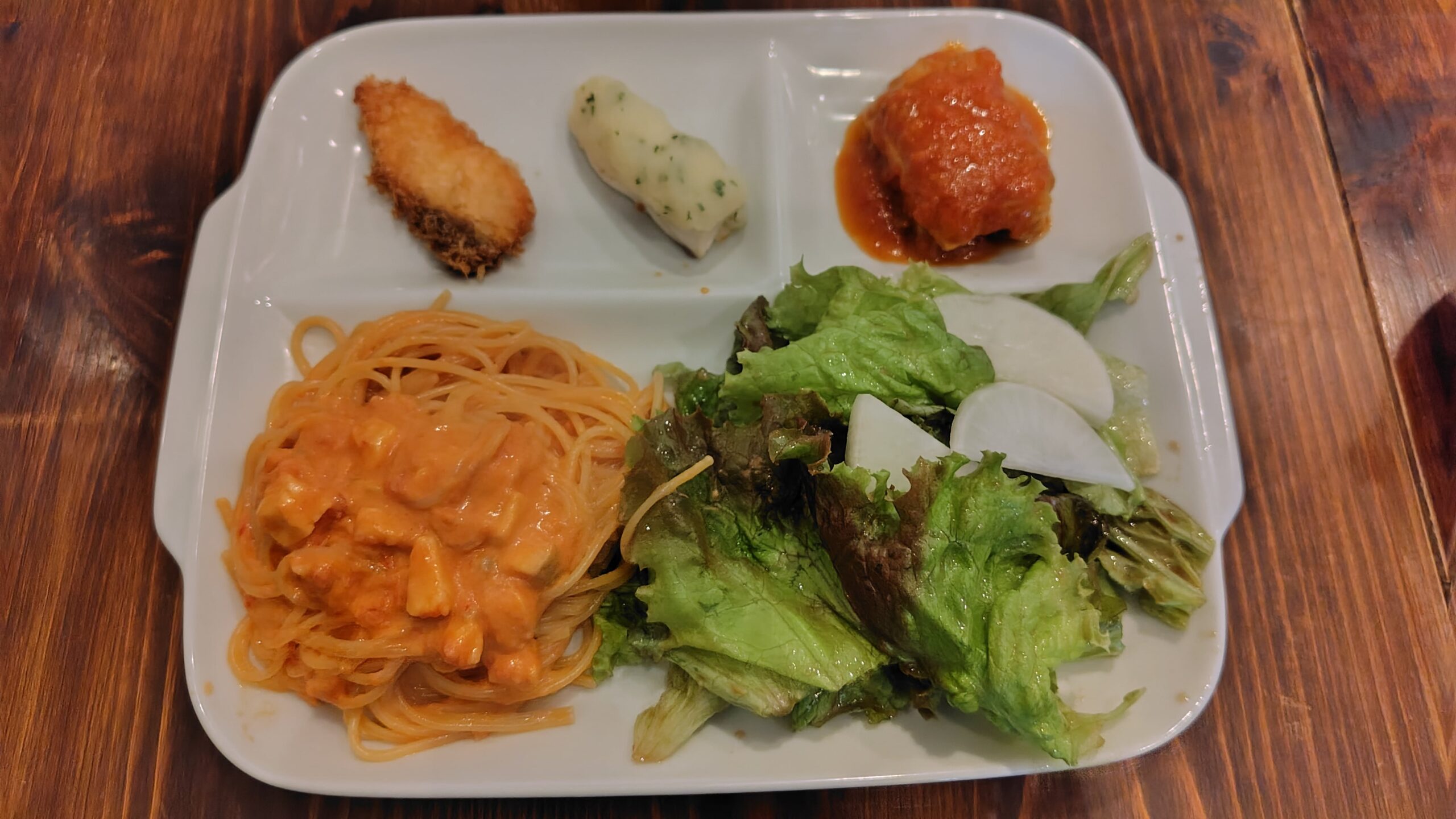 ランチのワンプレートは、肉や魚もついていておすすめ!